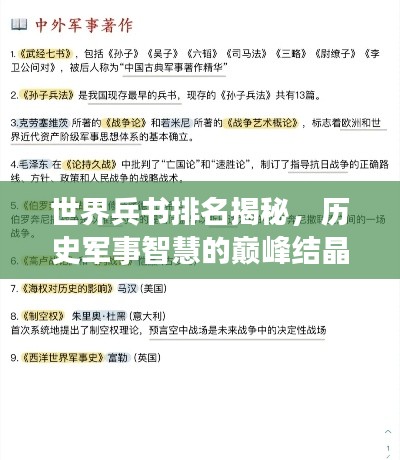 军事领域是人类历史长河中不可或缺的一部分,而兵书则是军事智慧的结晶,兵书不仅仅是战争的指导手册,更是人类文明的瑰宝,本文将为您揭示世界兵书的排名,带您走进军事智慧的殿堂。